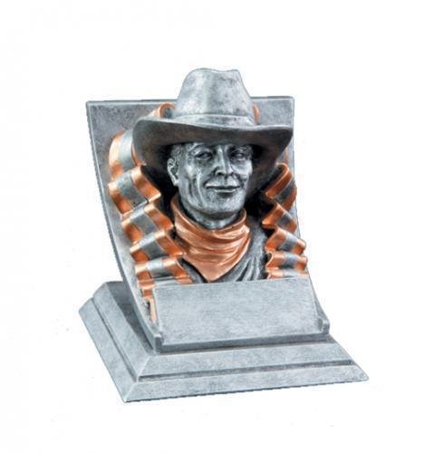Capture your school spirit with this cowboy mascot award. The highly detailed head of the cowboy complete with a western hat and bandana highlight this realistic representation of the icon. An elegant gold and pewter colored ribbon surround the cowboy. The base has plenty of room for whatever your personalization needs are.