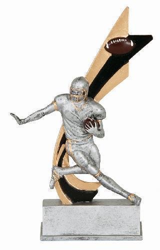 This Football Live Action award has many unique features that set it apart. Boasting a football player with his hand out stretched to ward off defenders while cradling the football in the other hand all set against a gold and black tone action ribbon gives the award a dynamic look. A brown football with detailed white finger lacing completes the look. This award stands 8″ tall and has plenty of engraving area on the base to accommodate your personalization needs. The gold and pewter finish highlights this award, making this the perfect football award.